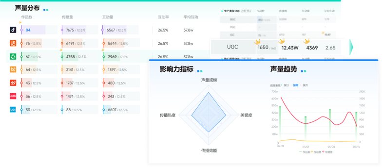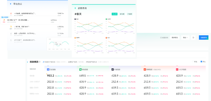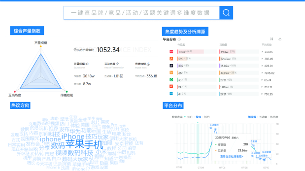 输入关键词,获取多平台声量趋势、平台分布以及热议方向等,帮助企业快速感知传播趋势、定位关键内容
