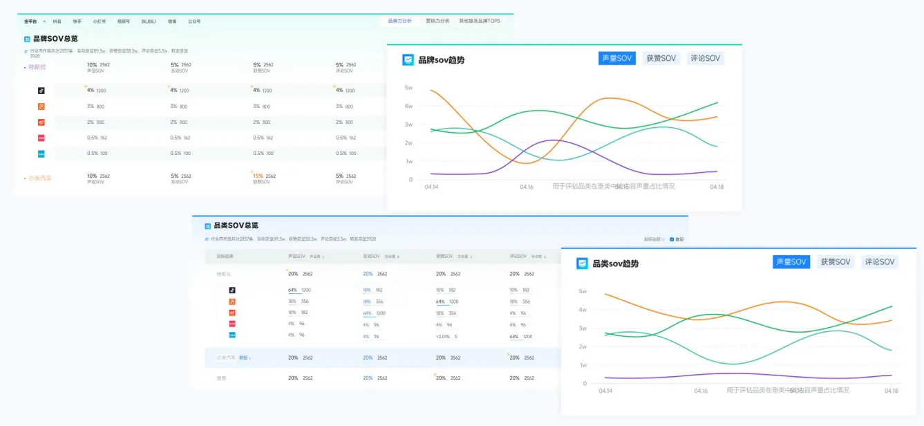 不仅实时监测品牌在各平台的声量变化趋势、还能查询品牌SOV、搜索指数等,帮助品牌判断影响力变化。