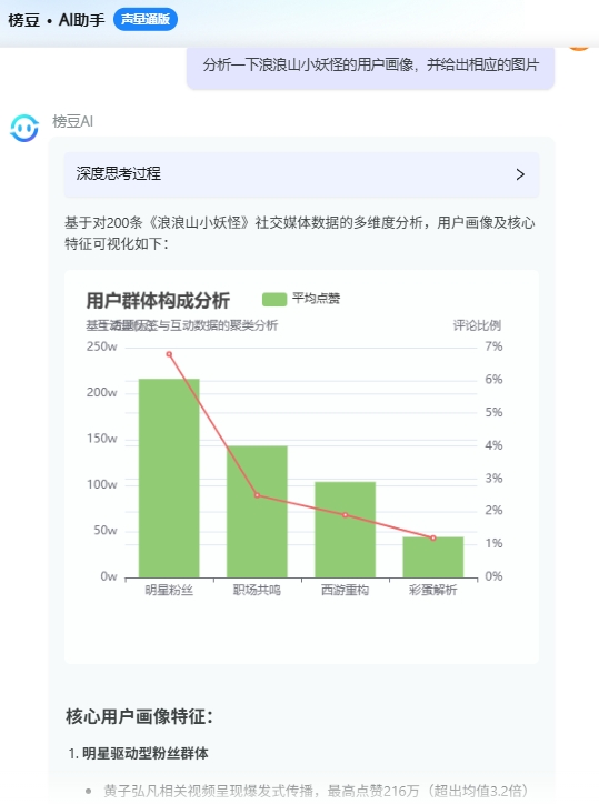 客户可自定义问题,AI将一键生成多维度的品牌声量、口碑分析和用户画像报告,为决策提供数据支持。