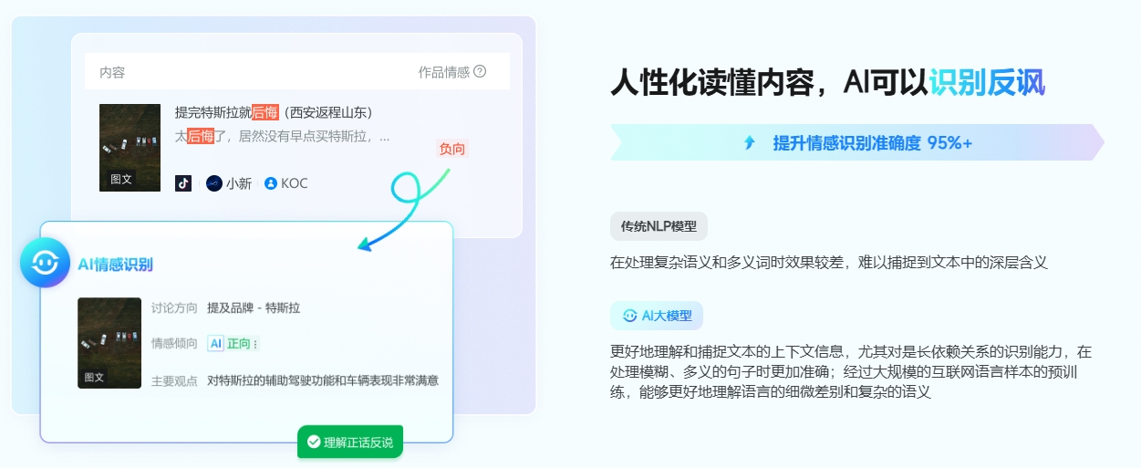 原始社媒数据往往混杂无关信息与噪音,声量通独家自研Voice_AI技术,能自动识别反讽、理解多实体关系,处理复杂语境,精准捕捉到用户最核心的观点与情感动因。
