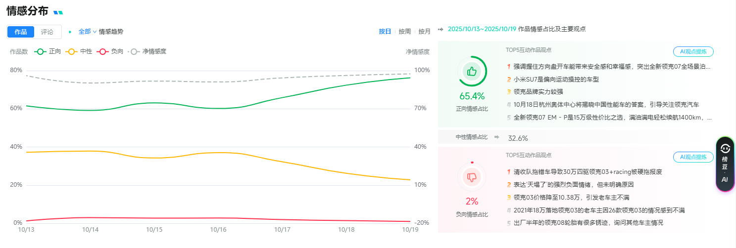 1、用户情感倾向: 针对金融行业专业术语多、用户关注点特殊的特点,声量通优化 AI 情感分析模型,可精准识别包含 LPR、定投、理赔、风控等专业词汇的内容情感倾向,避免因语义误解导致的情感判断,声量通情感识别正确率达90%及以上,帮助品牌判断用户在所有提及和互动中,正面、中性和负面评价各自占比多少?