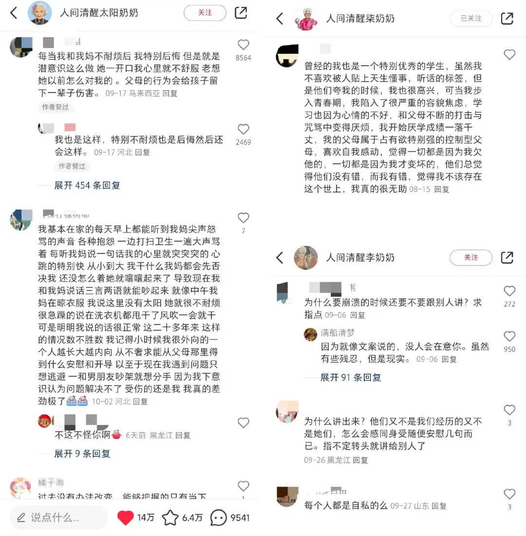 这些语录戳中了不少网友的心事,在AI奶奶们的评论区,能看到不少真情实感的留言,他们有的在分享自己的痛苦经历,有的在表达对AI奶奶清醒发言的赞同,热闹程度不输真人博主。