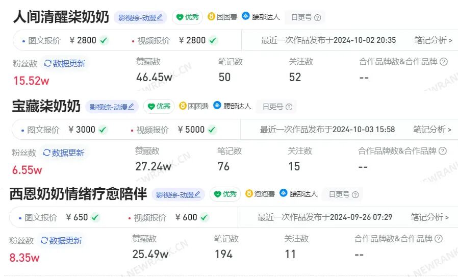这些账号大多只运营了两三个月,粉丝数并不多,但笔记数据不错。其中,“人间清醒太阳奶奶”粉丝9.1万,单条笔记最高获赞14万;“宝藏柒奶奶”粉丝数6.5万,单条笔记最高获赞9.6万;“宝藏罗奶奶”粉丝9.6万,单条笔记最高获赞8万。