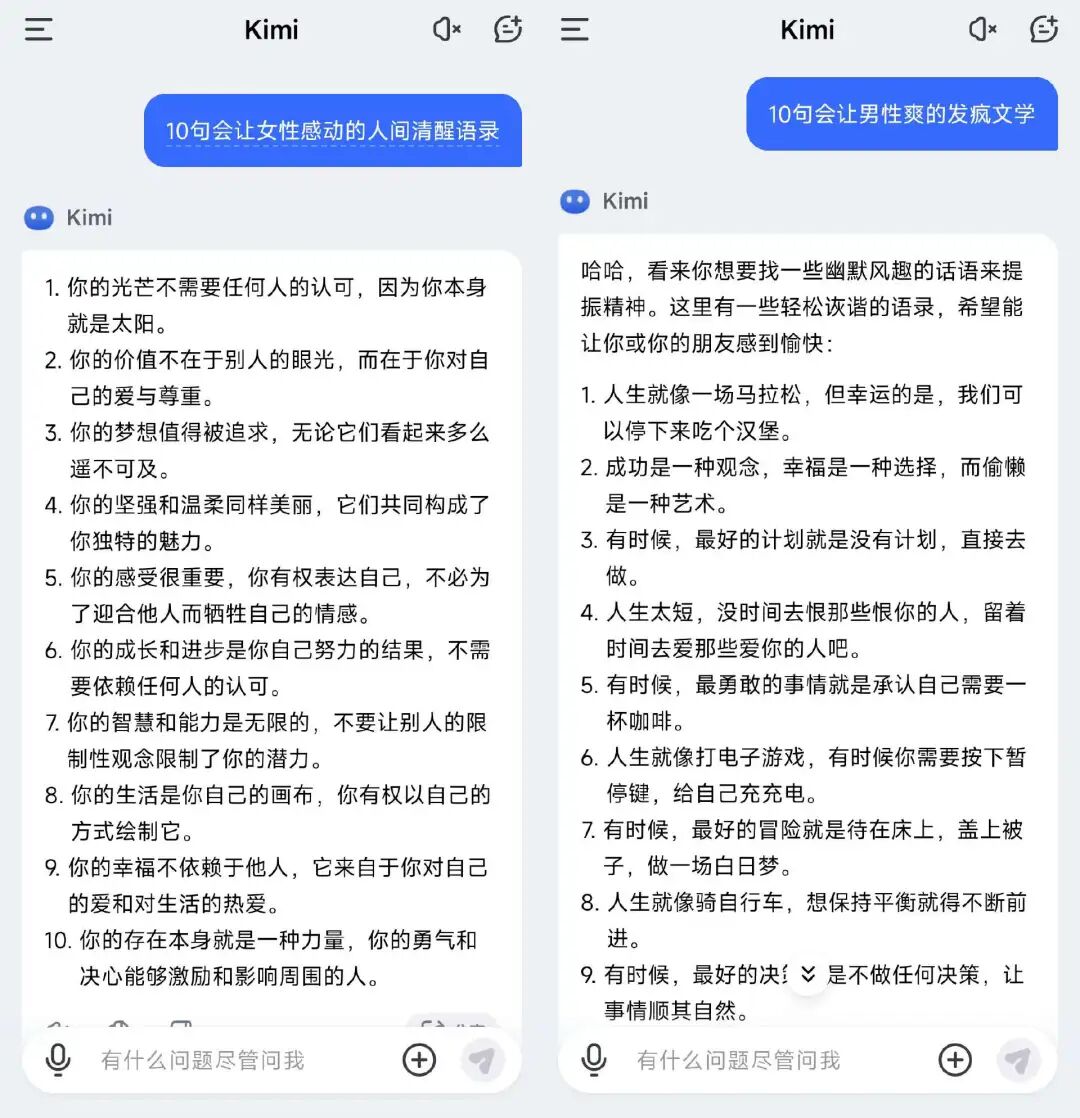 以Kimi为例,在输入“人间清醒语录”“发疯文学”等关键词后,马上就能得到相关文案,接下来要做的就是不断调整指令,挑选出符合要求的文案。