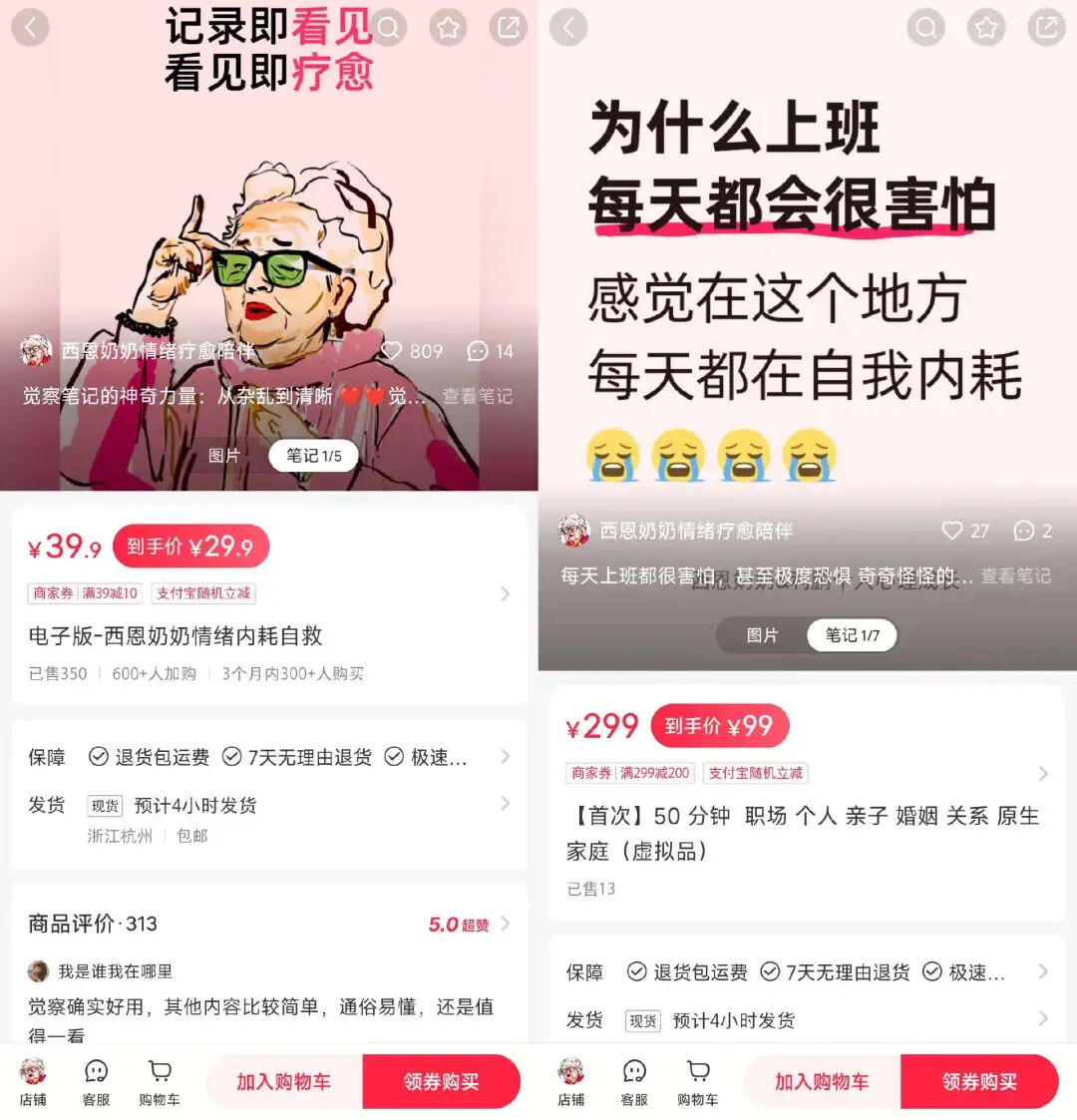 观察“西恩奶奶情绪疗愈陪伴”的小红书店铺,目前“西恩奶奶情绪疗愈陪伴”销量最好的产品是标价29.9元的电子版《西恩奶奶情绪内耗自救》,卖出350单,收入10220元,其次是标价99元的《14天情绪自救训练》,卖出43单,收入4257元。