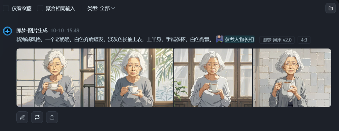 以即梦为例,打开即梦,点击图片生成,输入提示词“新海诚风格,一个老奶奶,白色齐肩短发,淡灰色长袖上衣,上半身,手端茶杯,白色背景”,导入参考图(我参考的是斯琴高娃的人物长相),模型选择“即梦 通用 v2.0”,精细度保持默认“5”,图片比例选择4:3,然后就会出现4张AI奶奶动漫照片。