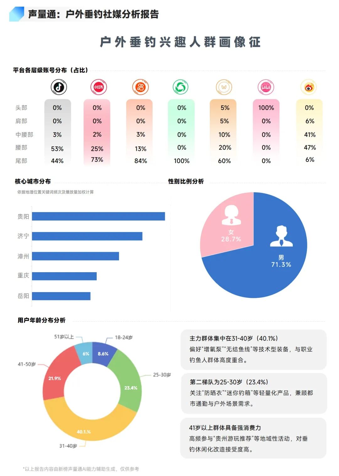 通过 AI 对数据的分析,户外垂钓的兴趣人群特征清晰呈现,在社交媒体上,钓鱼人群中 25 岁至 40岁中青年占比达 63.5%,已成为钓鱼主力军。