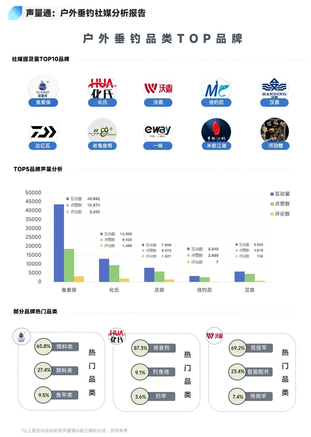 同时,钓鱼相关视频在社交平台上的发布量也呈现增长趋势 ,也衍生出了鱼爱保、化氏、沃鼎、佳钓尼等深受关注的热门品牌。如此火爆的户外垂钓市场,其背后有着怎样的发展态势和营销密码呢?我们准备了一份由新榜声量通 AI 能力辅助生成的《户外垂钓品类社媒分析报告》供大家参考。