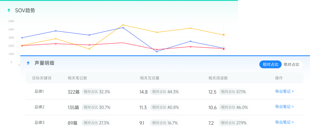 SOV是品牌方评估品牌市场影响力和竞争力的重要指标之一,常用来衡量品牌在特定市场或媒体渠道中,相对于竞争对手的广告、宣传或曝光的占比。使用声量通,企业能够快速查询行业SOV数据与趋势,评估自身的行业地位。
