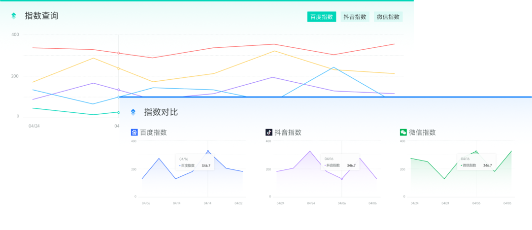 很多企业衡量自身推广效果的一个重要指标就是在各个平台查看搜索指数,搜索指数越高,证明近期的推广效果越好。在声量通,企业能够做到一屏查看百度、巨量、微信等多个平台搜索指数,综合对比企业在各平台的搜索热度。