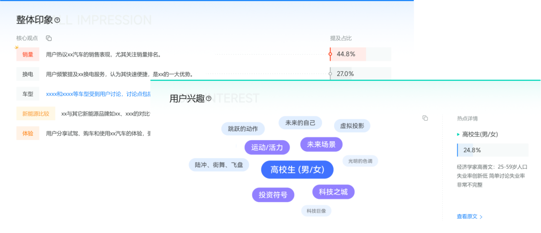 声量通会对用户在平台发布内容、互动等信息进行汇总分析,总结用户对企业的整体印象、用户兴趣点、用户槽点和用户建议,反哺企业优化推广策略,调整营销方向。