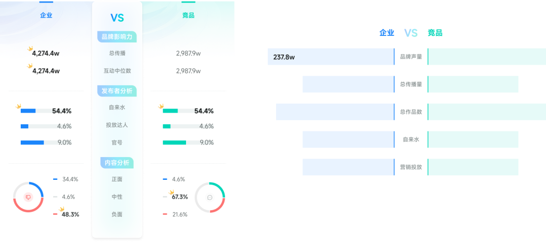 知己知彼,方能百战百胜。企业可以通过声量通与竞品进行多维度的声量对比,了解在用户侧、营销侧、内容侧等各方面的优势与不足,精准放大自身优势并补足短板,实现竞争超越。