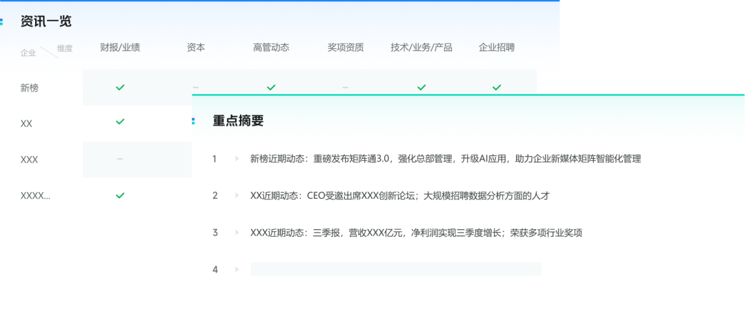 汇总展示企业相关的财报、高管动态、奖项、产品更新等资讯内容,及时了解企业的最新动向。