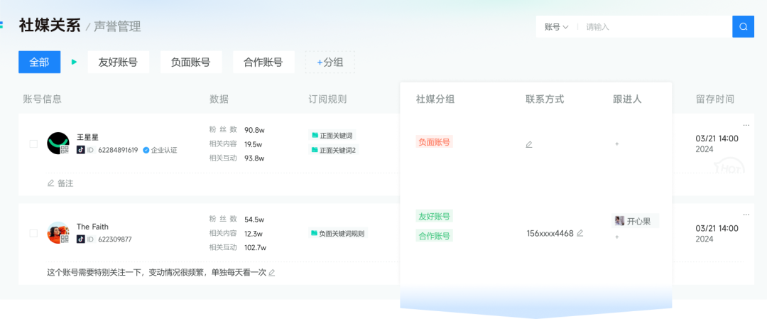 声量通在社媒关系管理板块,协助企业建立社媒账号资源库,使其快速定位到有关联的发声账号,如竞品、kol大号、合作账号等,方便随时查找、复用、继承以及二次合作等,提升达人联络速度,及时处理正负面内容。