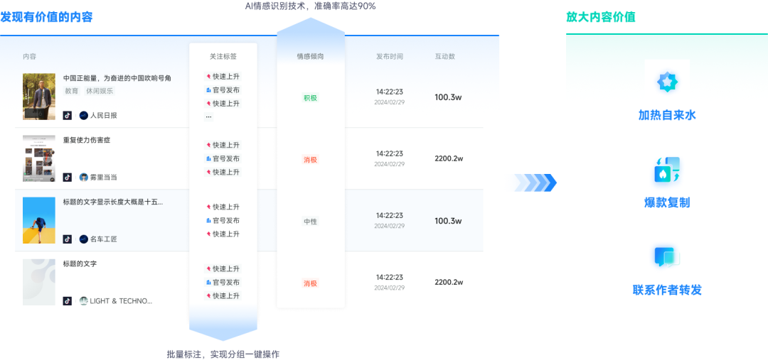 在声量通,企业也能够发现品牌的正面自来水,通过对这些内容进行后向的加热或复制推广,就能快速放大优质内容的传播面,在短期内迅速提升品牌影响力。