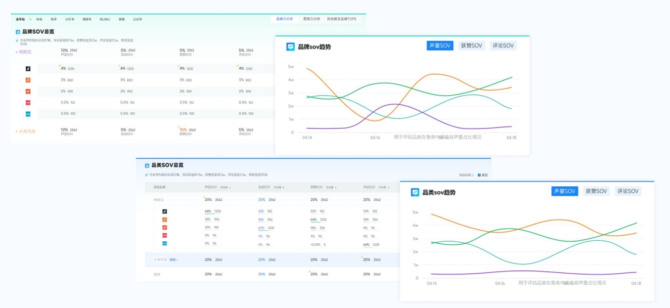 2、品牌声量监测:实时追踪品牌在抖音、小红书等7大主流社媒平台的声量数据、SOV、搜索指数等;