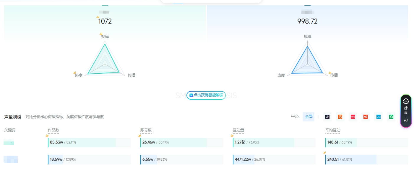 一键对比竞品声量趋势、传播量、爆款内容等。