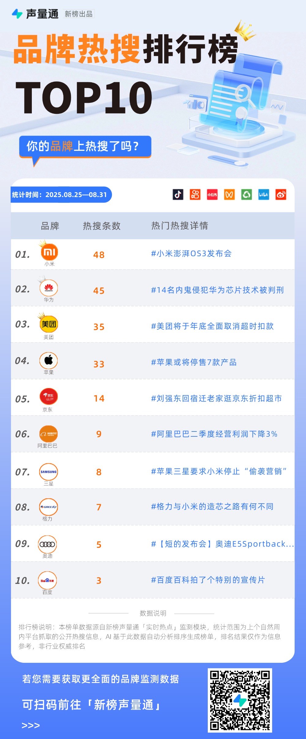 上周(2025.08.25—08.31)品牌圈热度居高不下,小米、华为、美团等 10 大品牌凭借关键事件冲上热搜,在社媒平台掀起讨论热潮。从科技赛道的技术博弈,到生活服务、零售领域的模式创新,品牌们通过多元营销动作,精准抢占消费者心智。