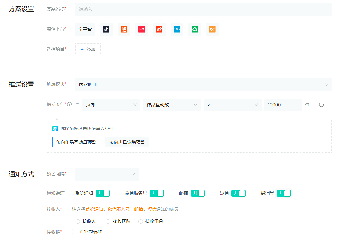 (1)设定科学预警阈值:在声量通后台,可根据品牌实际情况,灵活设置预警规则。例如:
