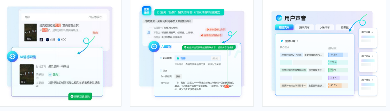 情感脉搏精准把握:声量通的VOICE_AI技术能对每条笔记/评论进行情感判断(正面、中性、负面),不同于传统NLP模型,VOICE_AI支持识别反讽、能理解多实体关系,还能自动去噪,情感识别准确率达95%。