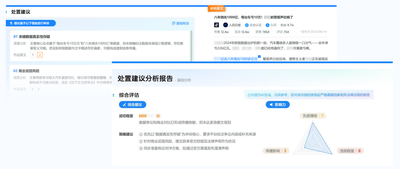 (3)生成处置建议报告:声量通可同步生成《舆情处置建议报告》,声量通将依据平台规定和法律法规,基于舆情具体内容,逐句研判和评估,直接生成维权举证材料,企业可直接复用。